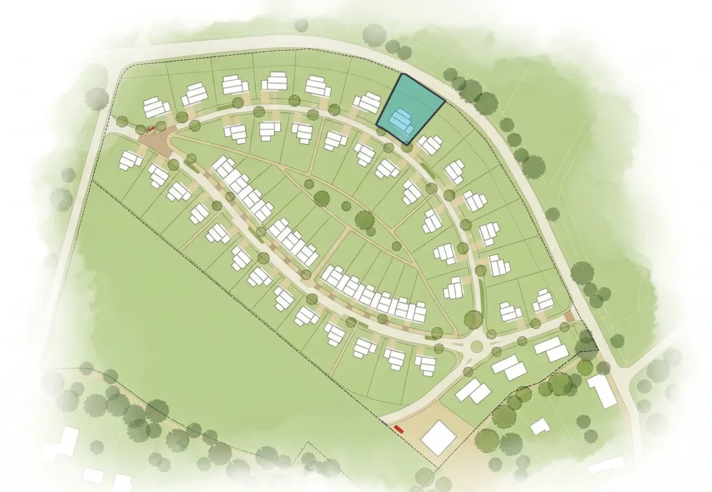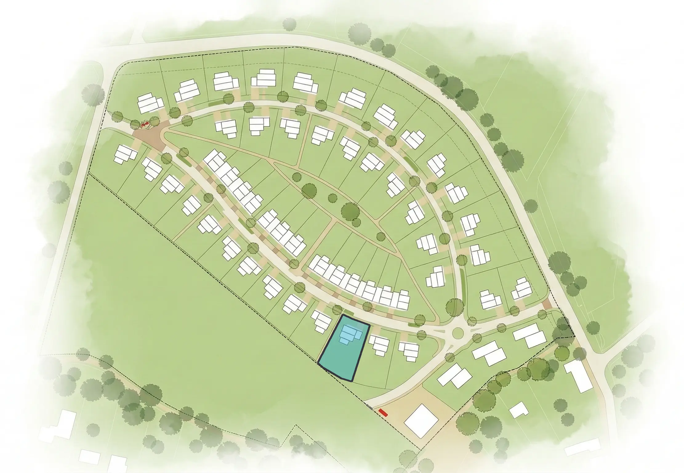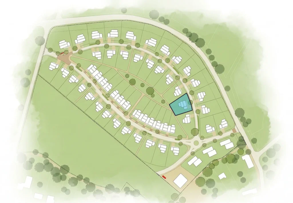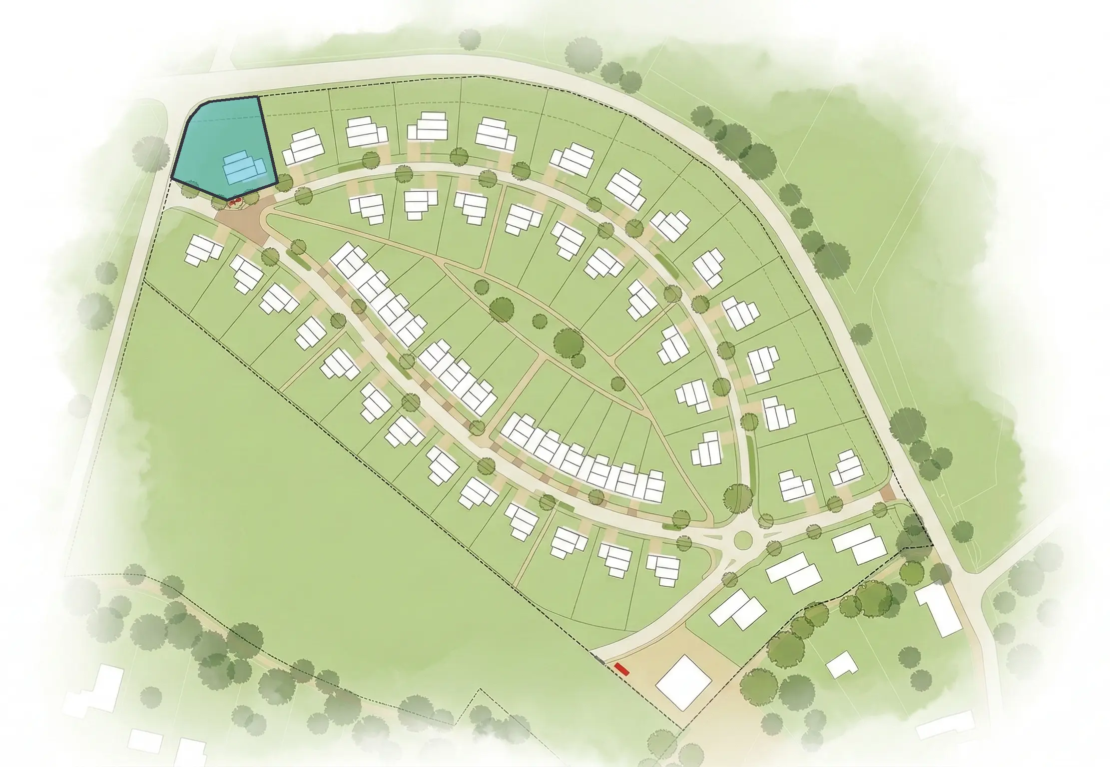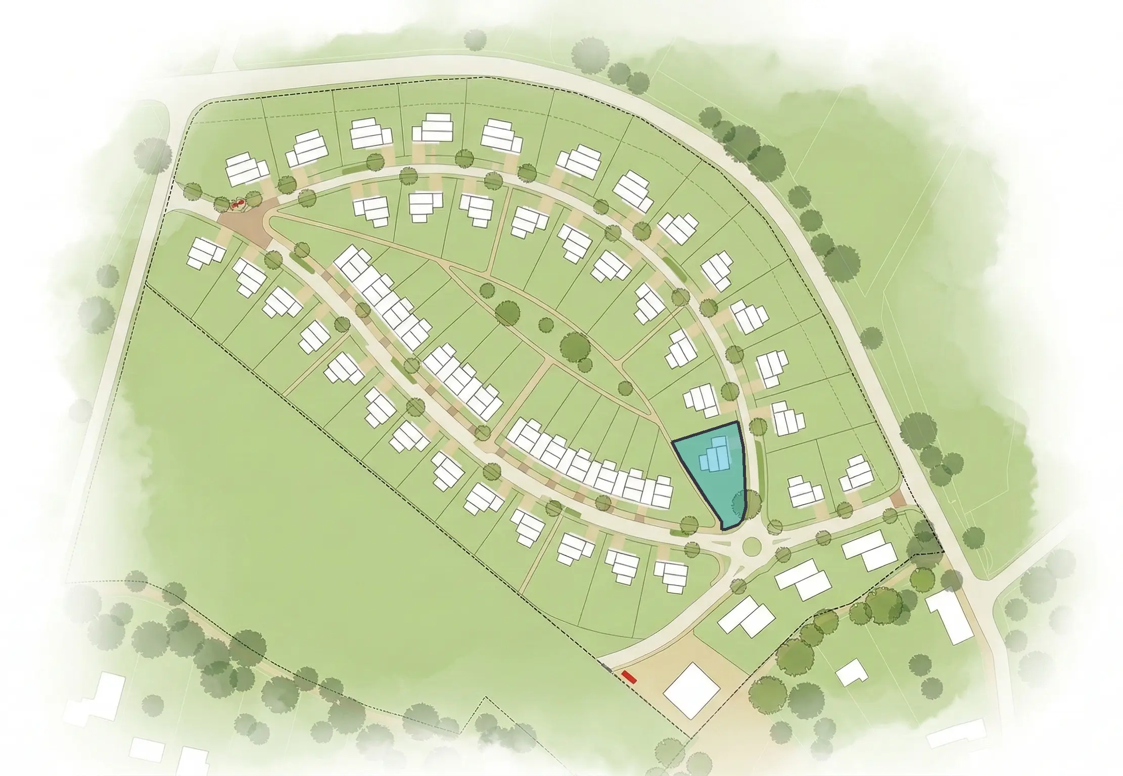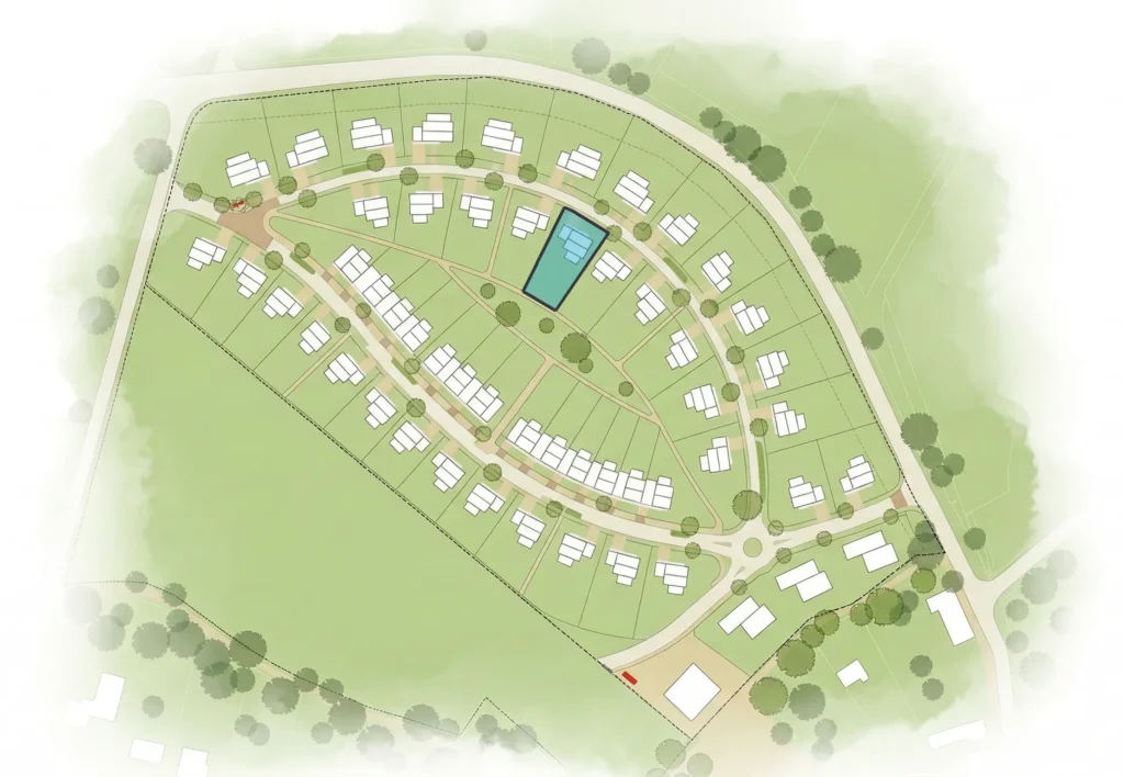 Centální pozemek v srdci výstavby blízko sociální infrastruktury.