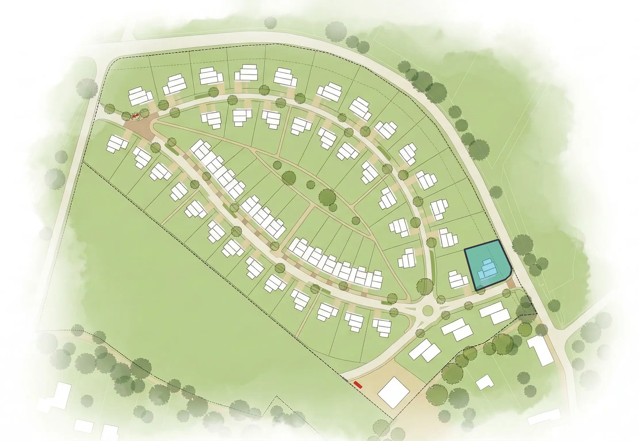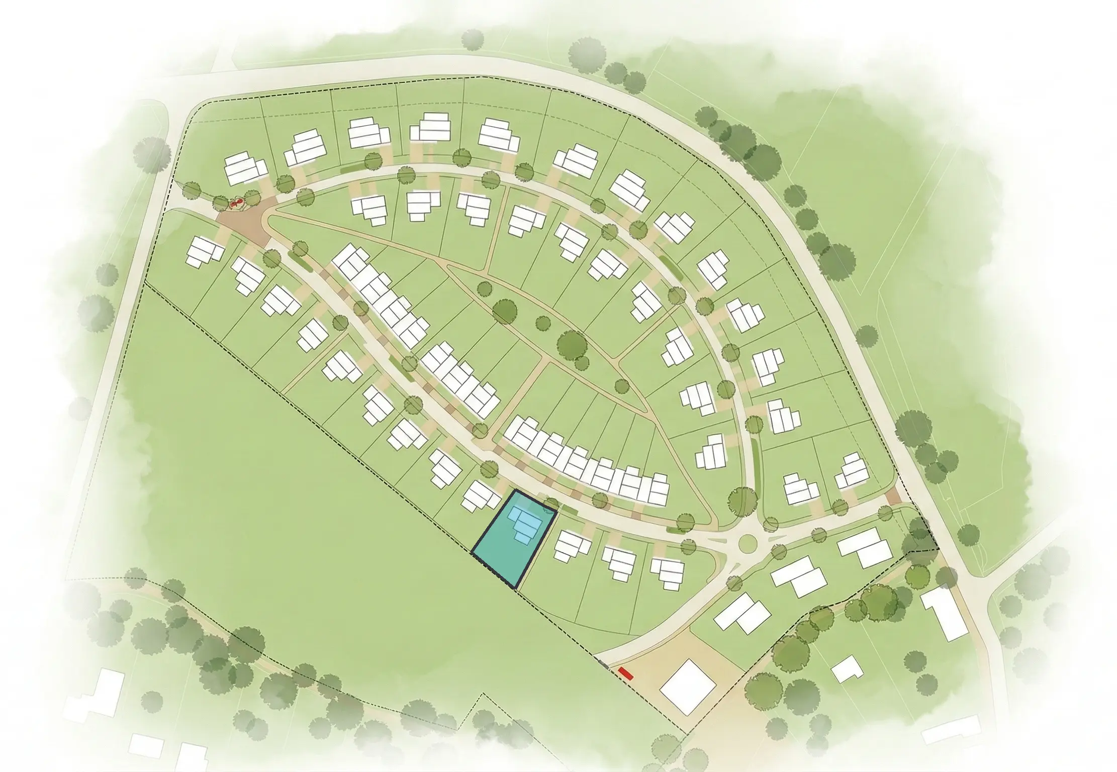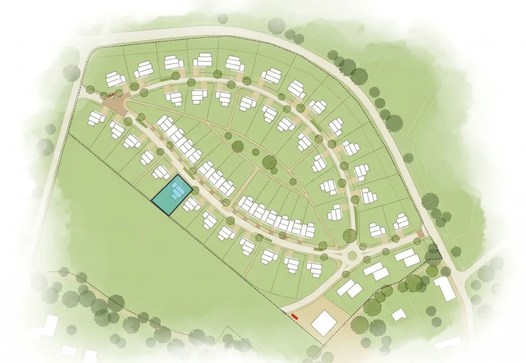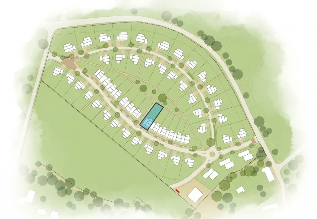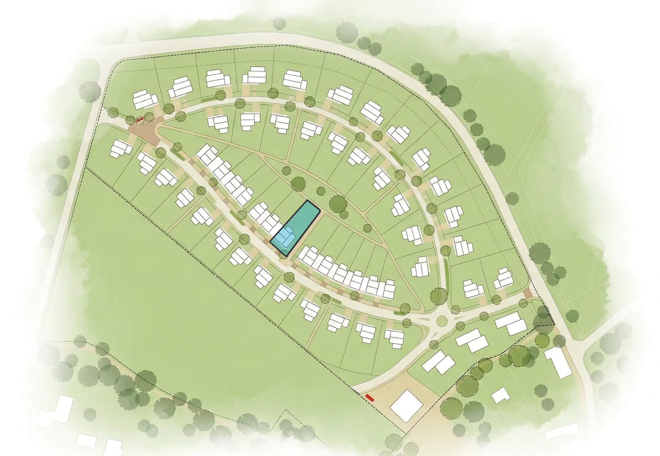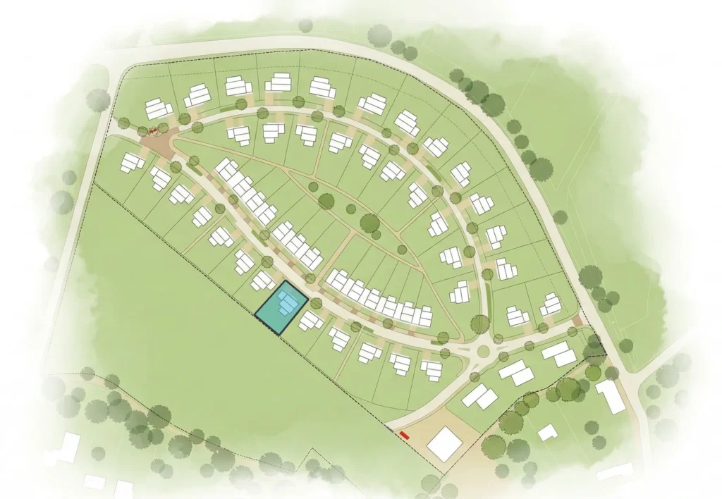 Centální pozemek v srdci výstavby blízko sociální infrastruktury.