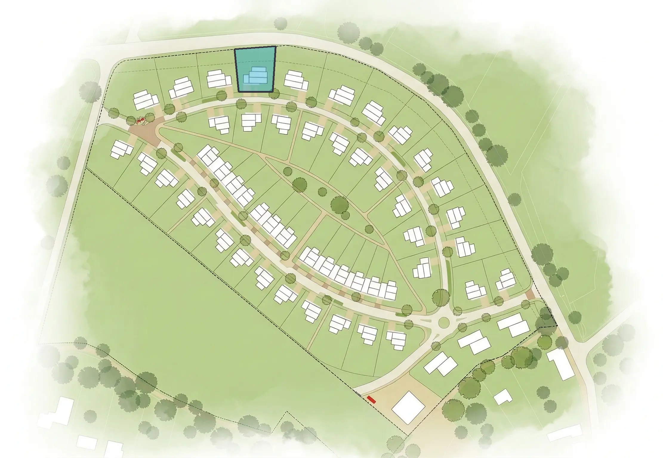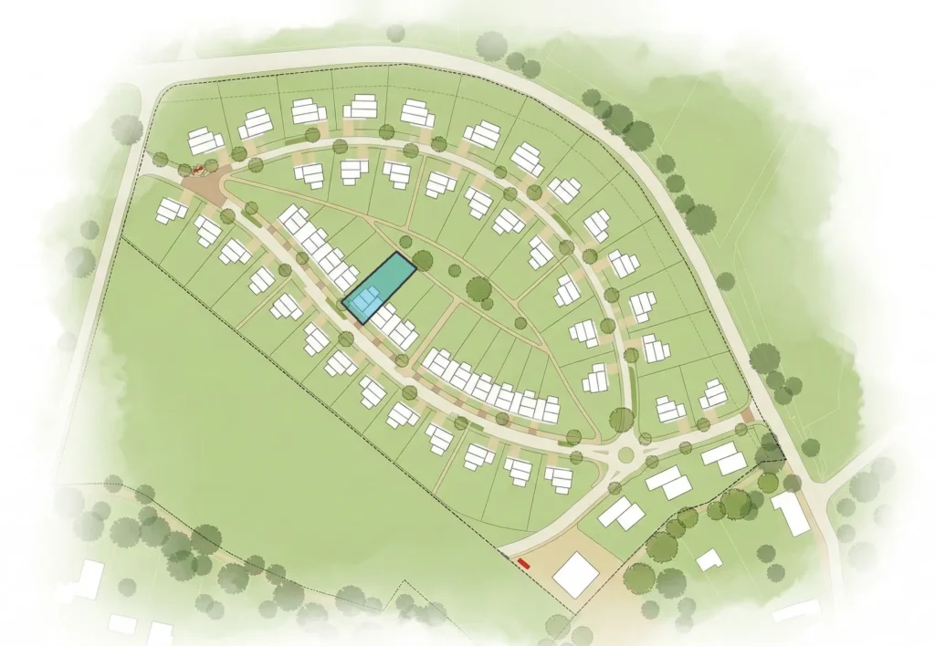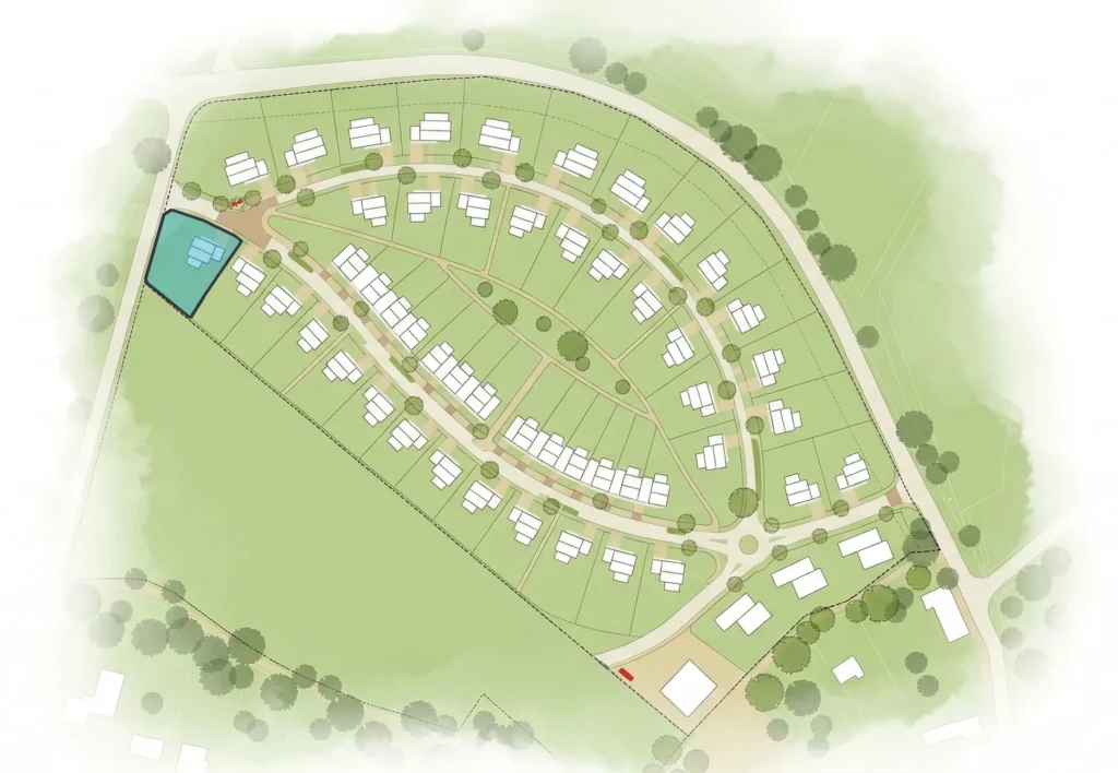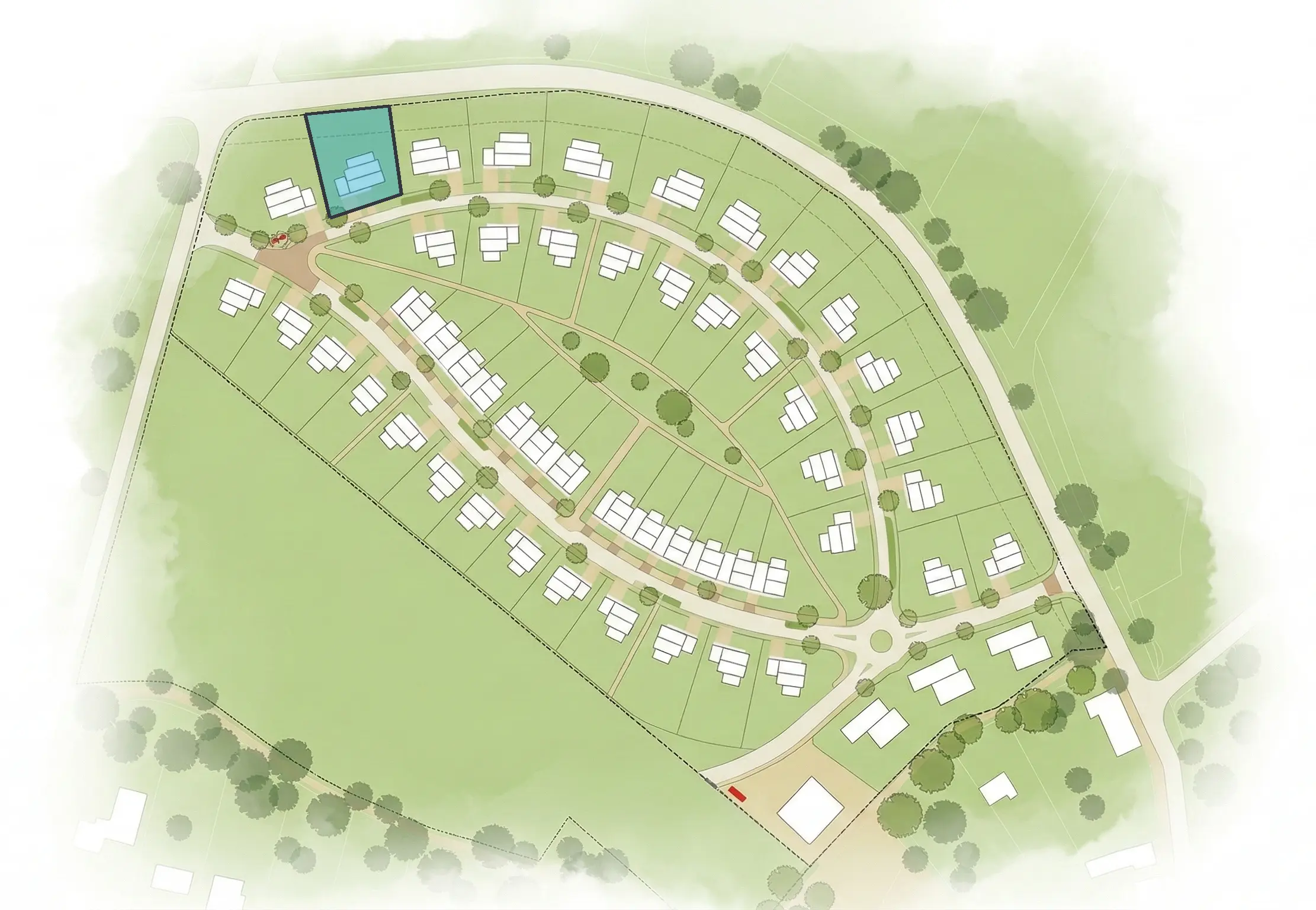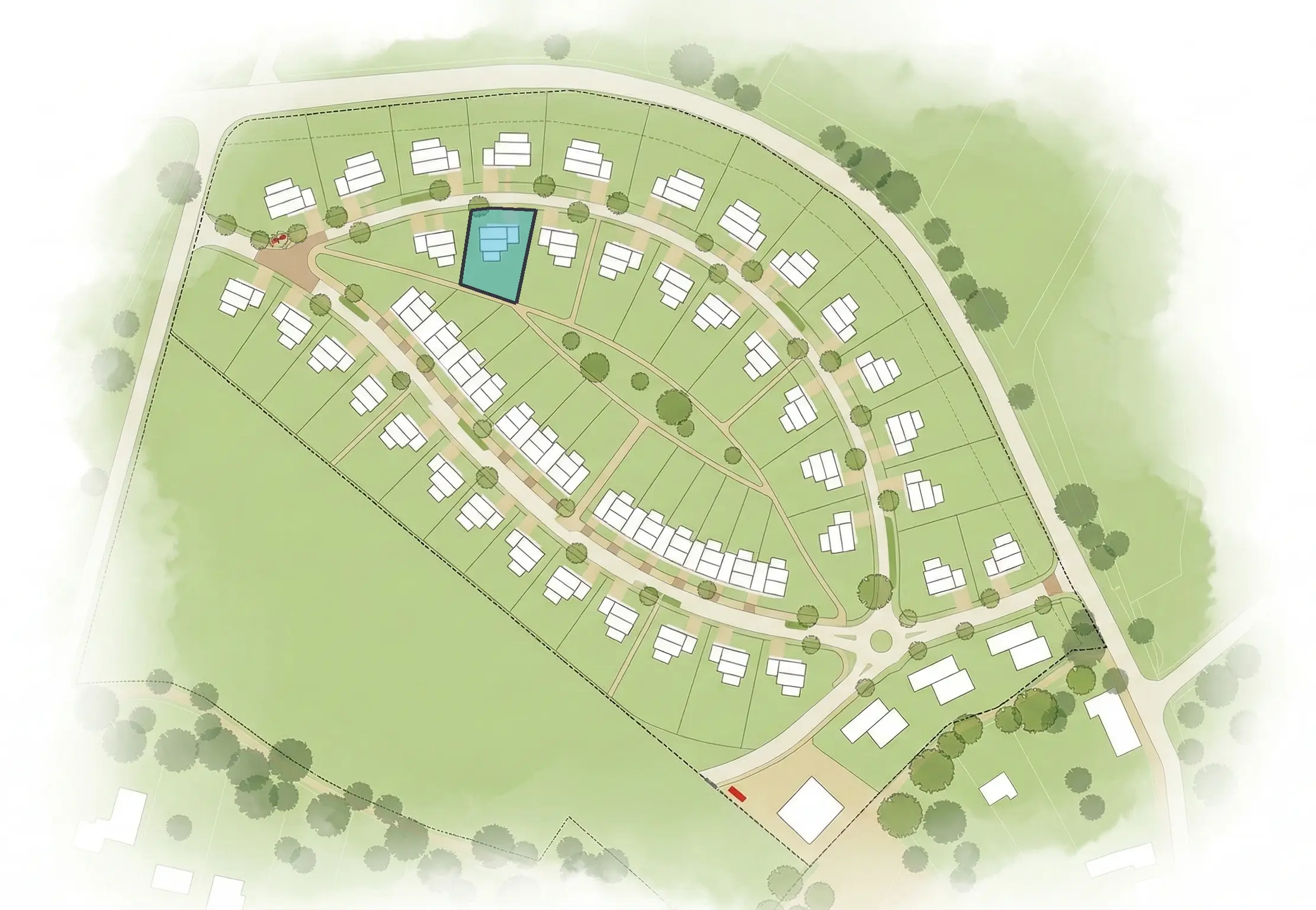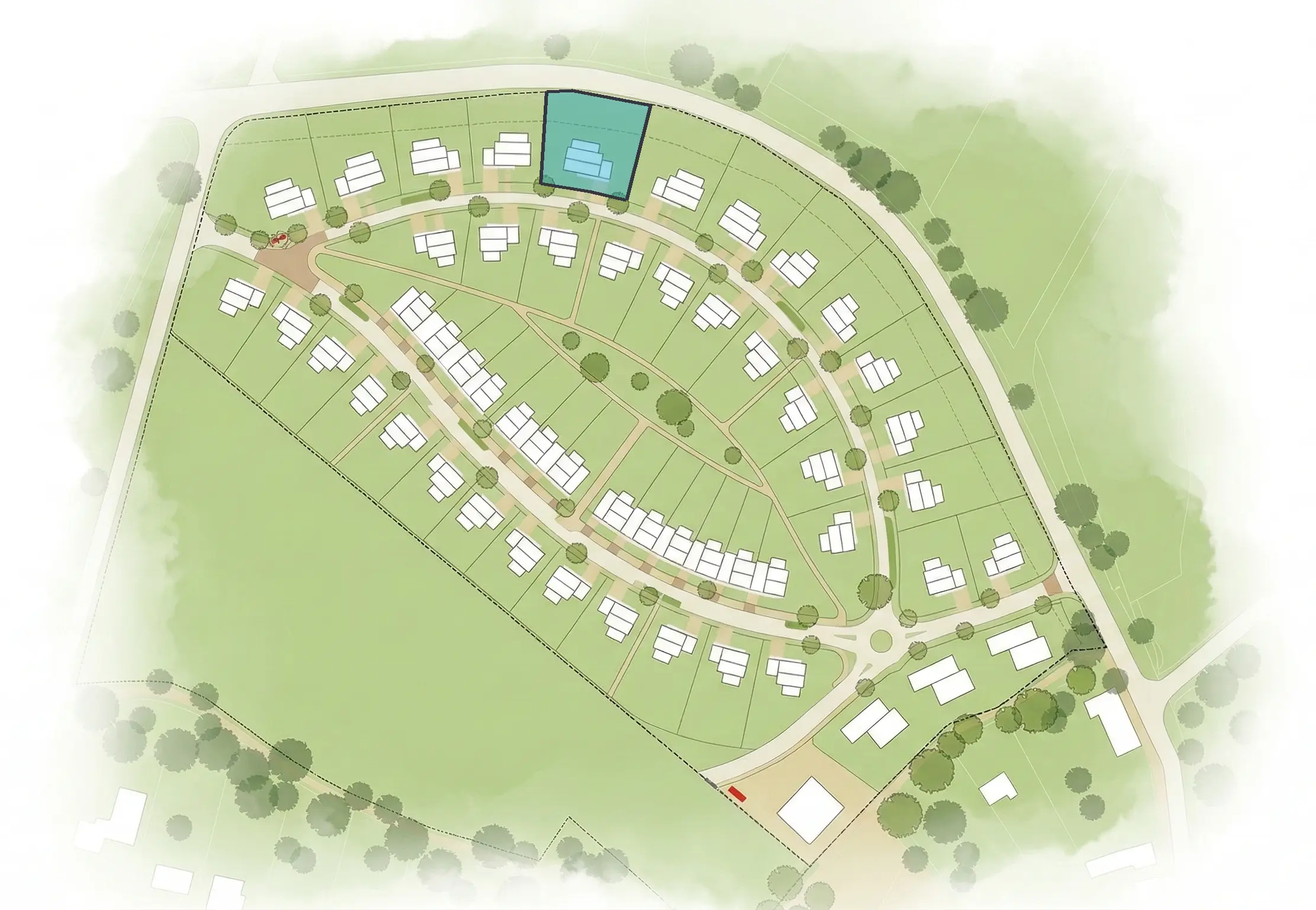 Centální pozemek v srdci výstavby blízko sociální infrastruktury.