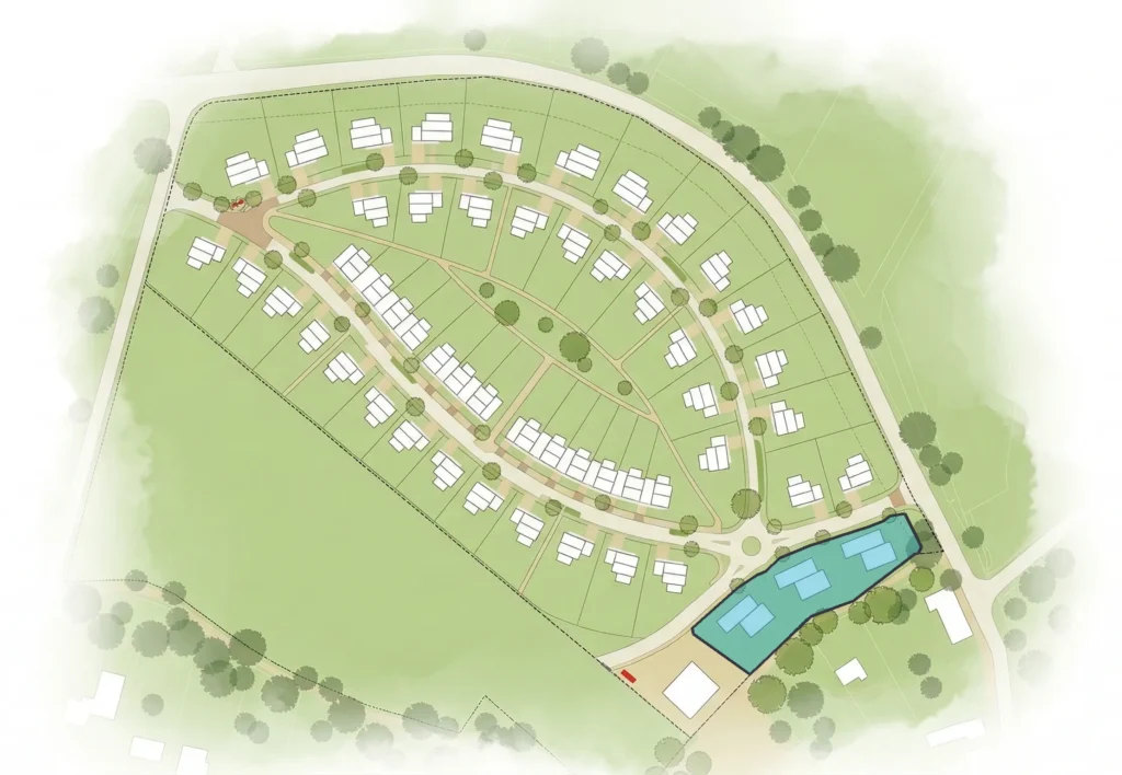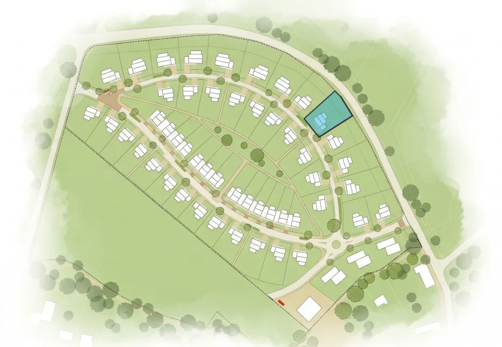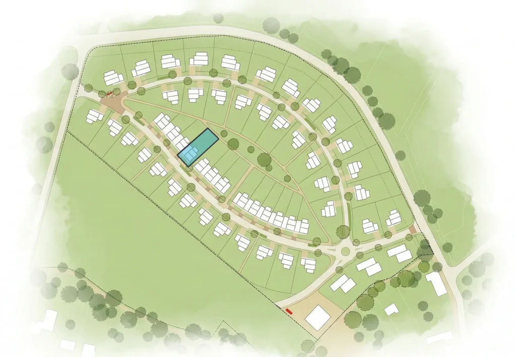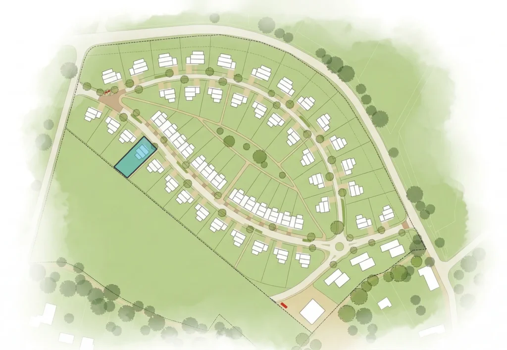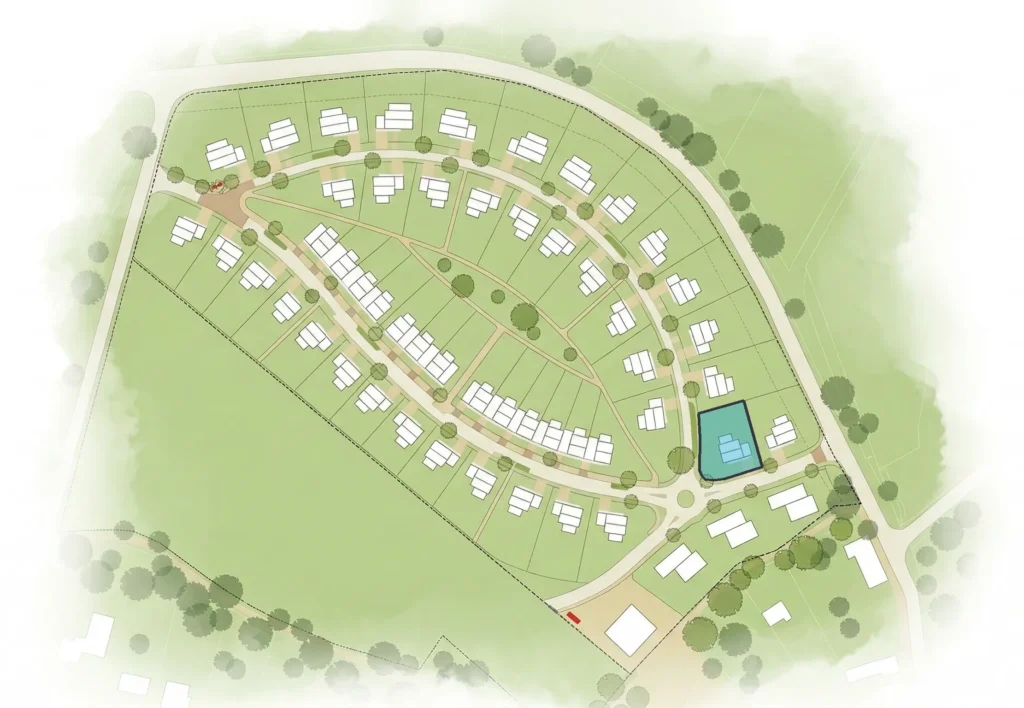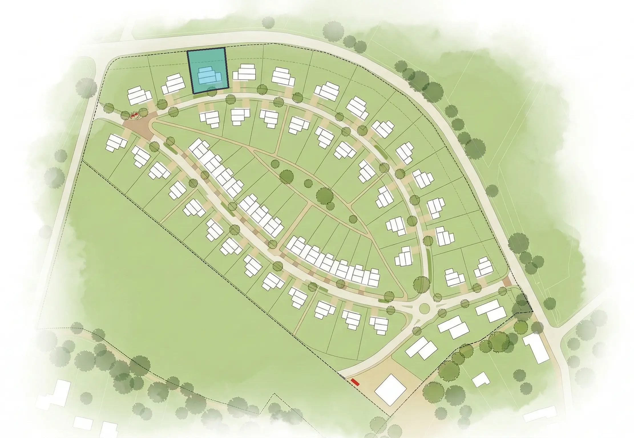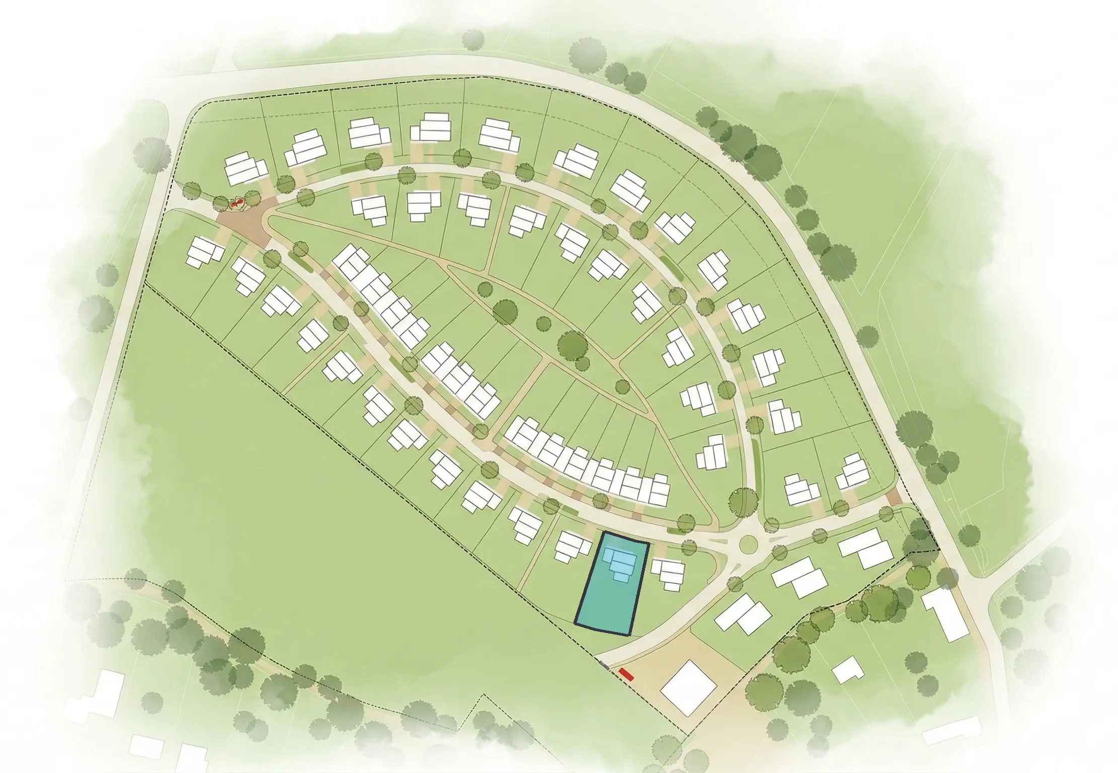 Centální pozemek v srdci výstavby blízko sociální infrastruktury.