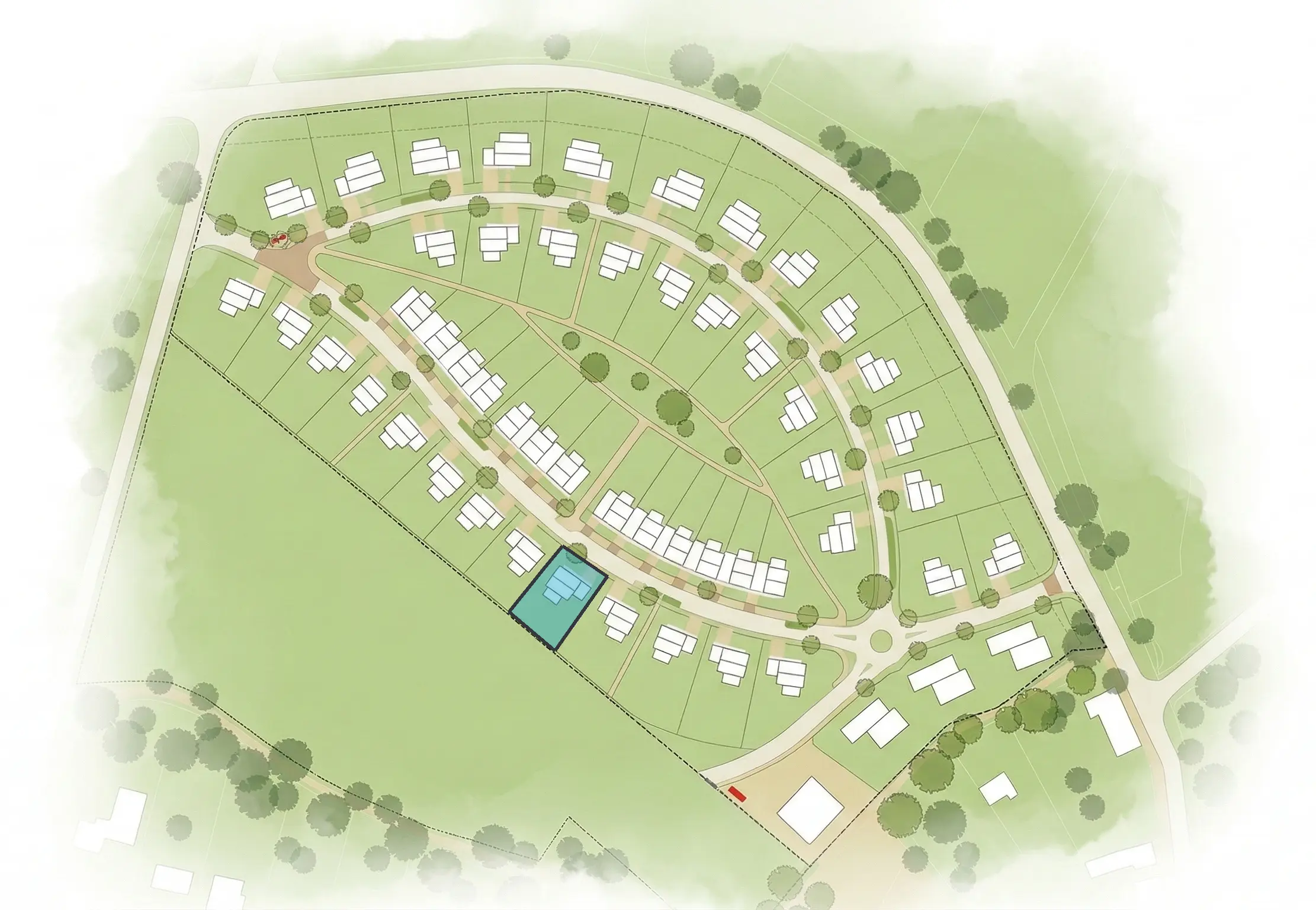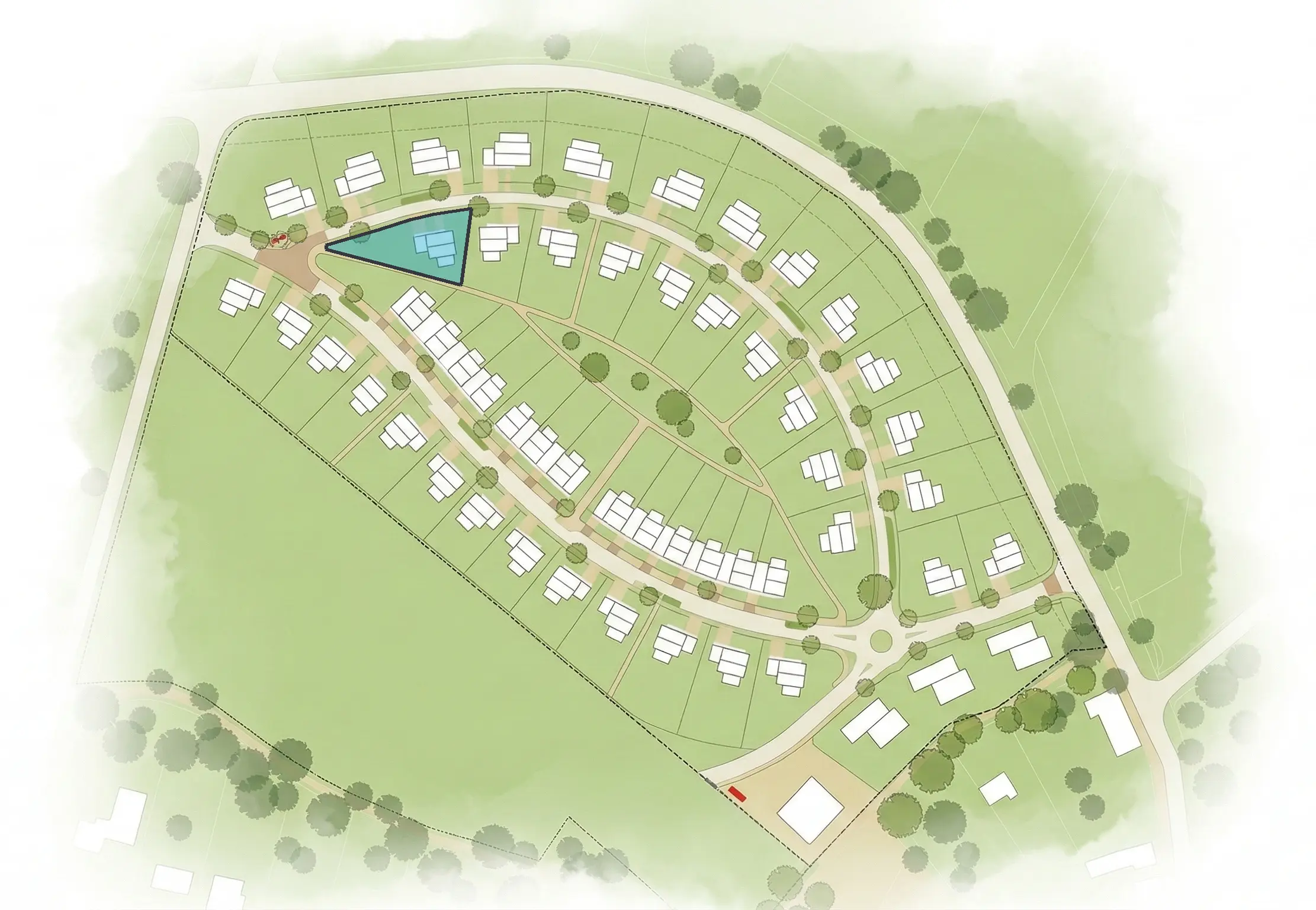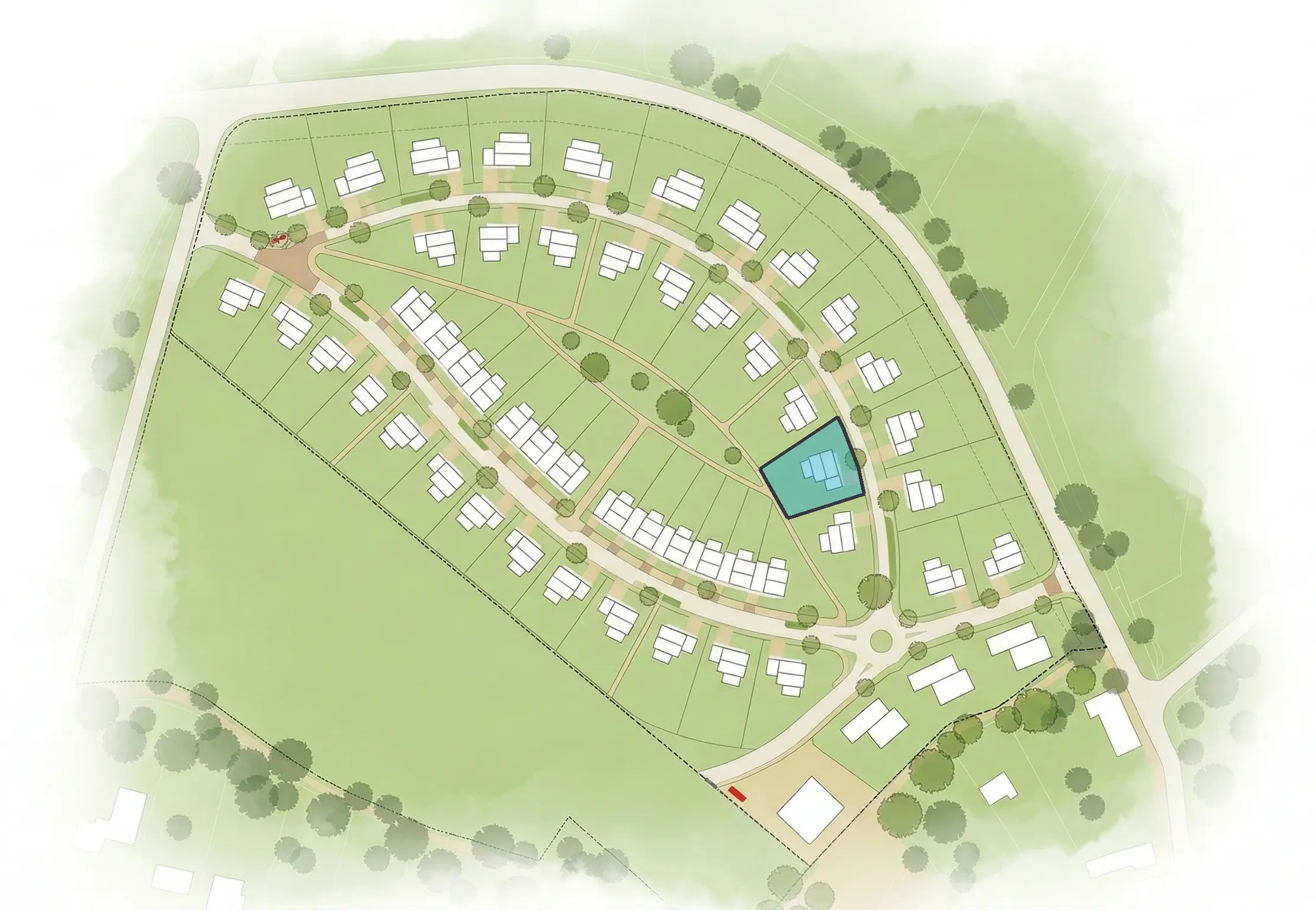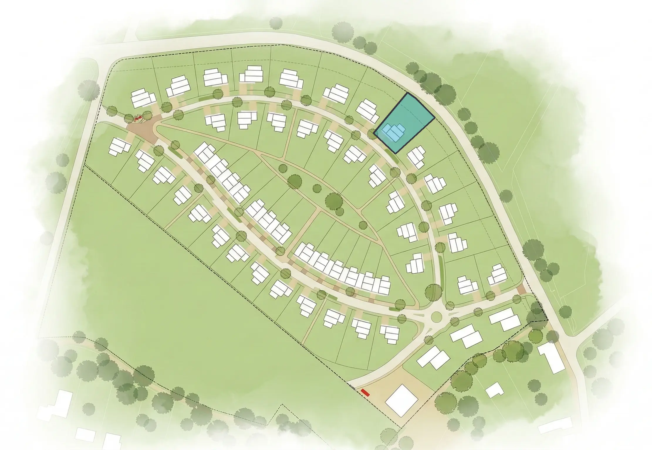Krajní pozemek s malým počtem sousedů blízko sociální infrastruktury.