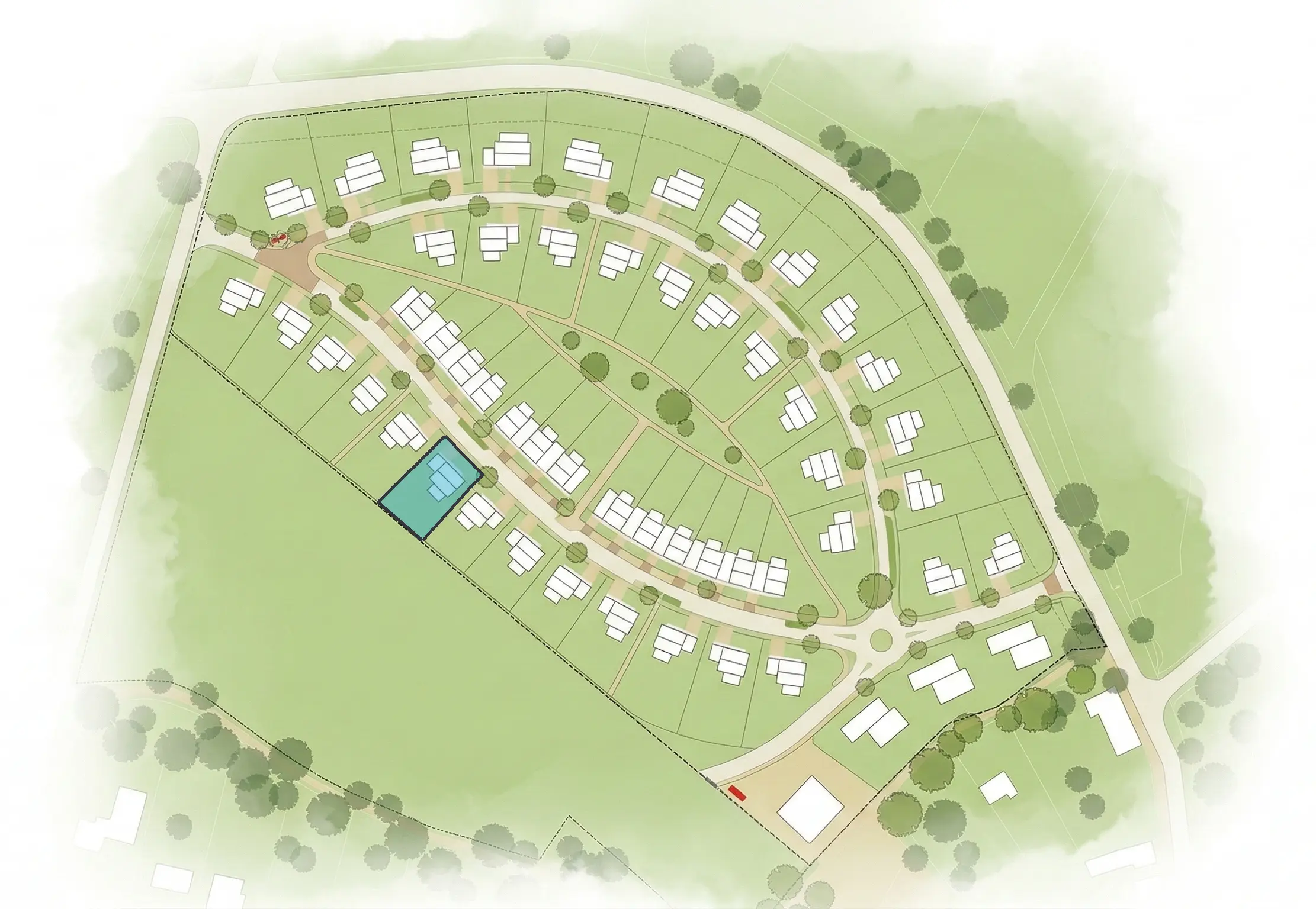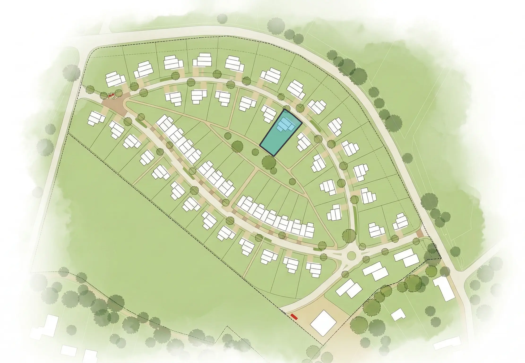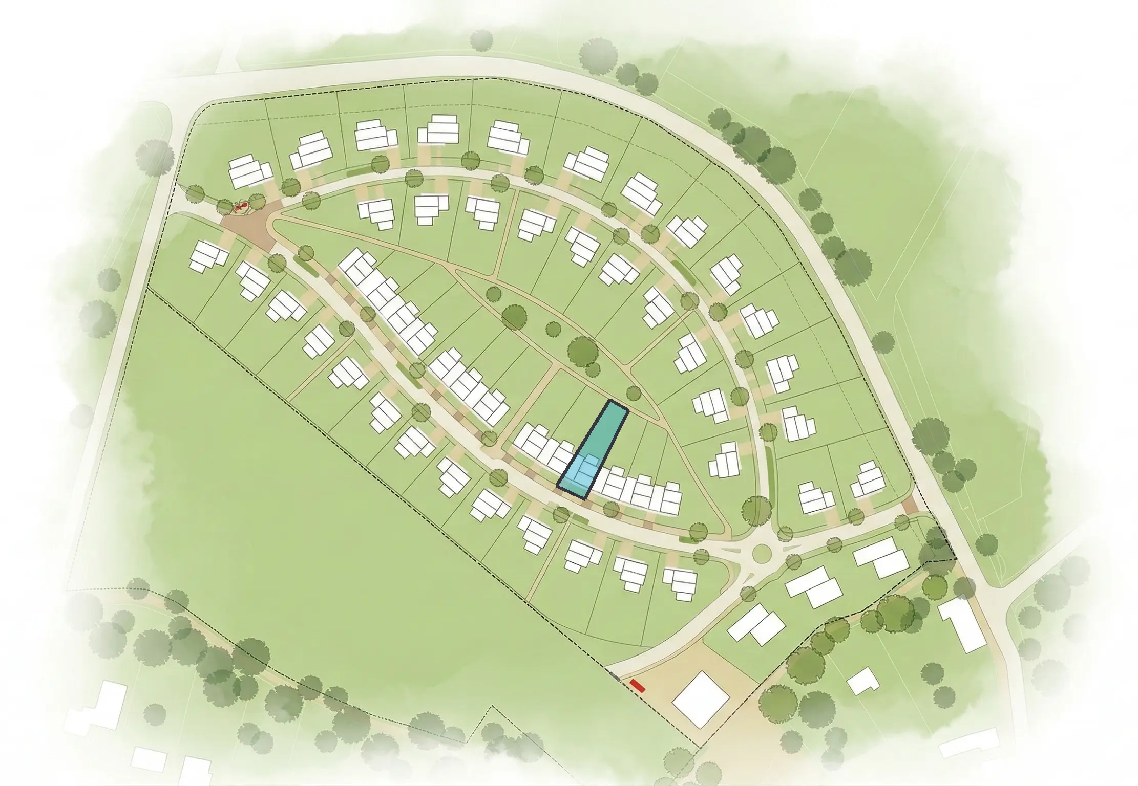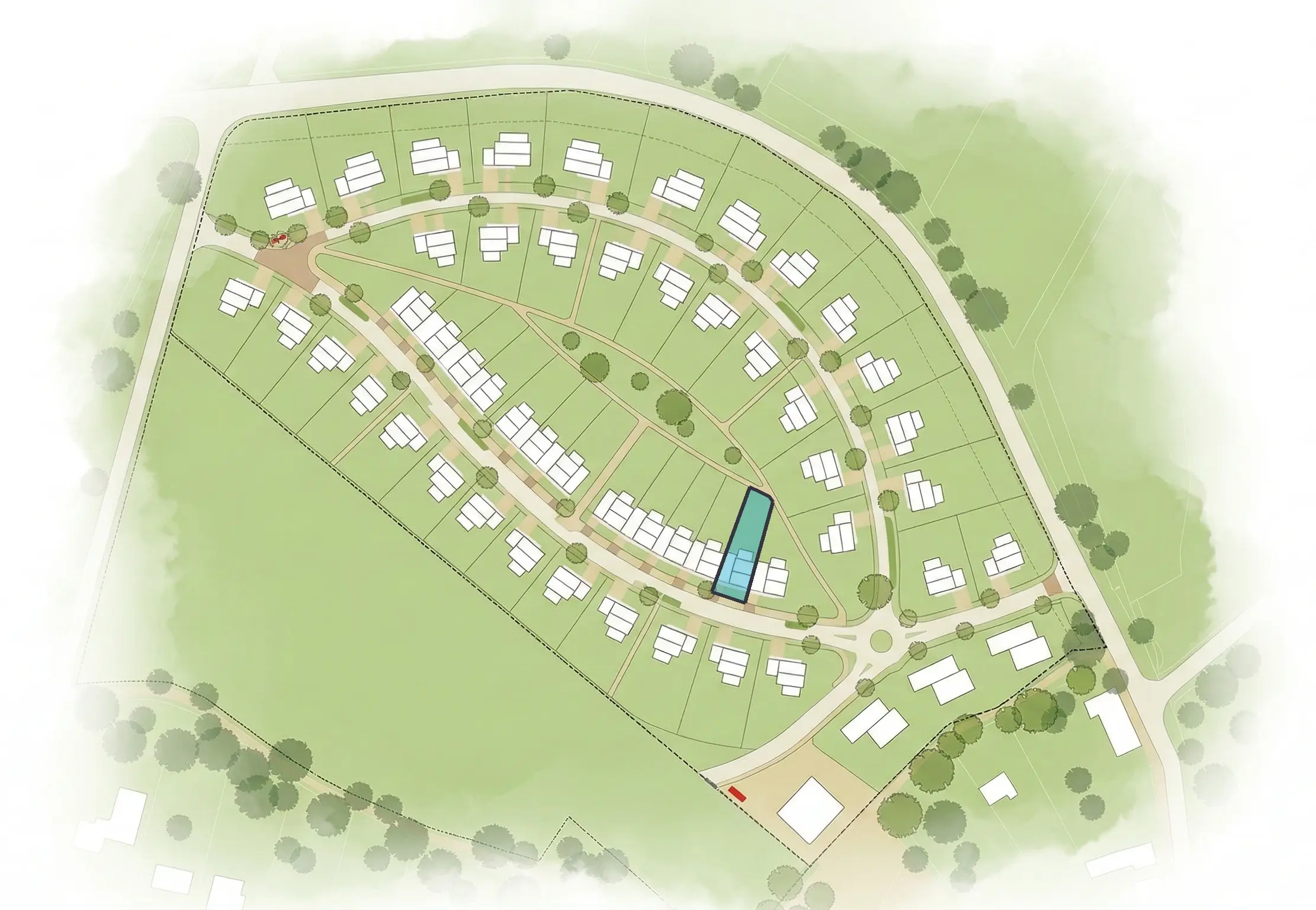 Krajní pozemek s malým počtem sousedů blízko sociální infrastruktury.