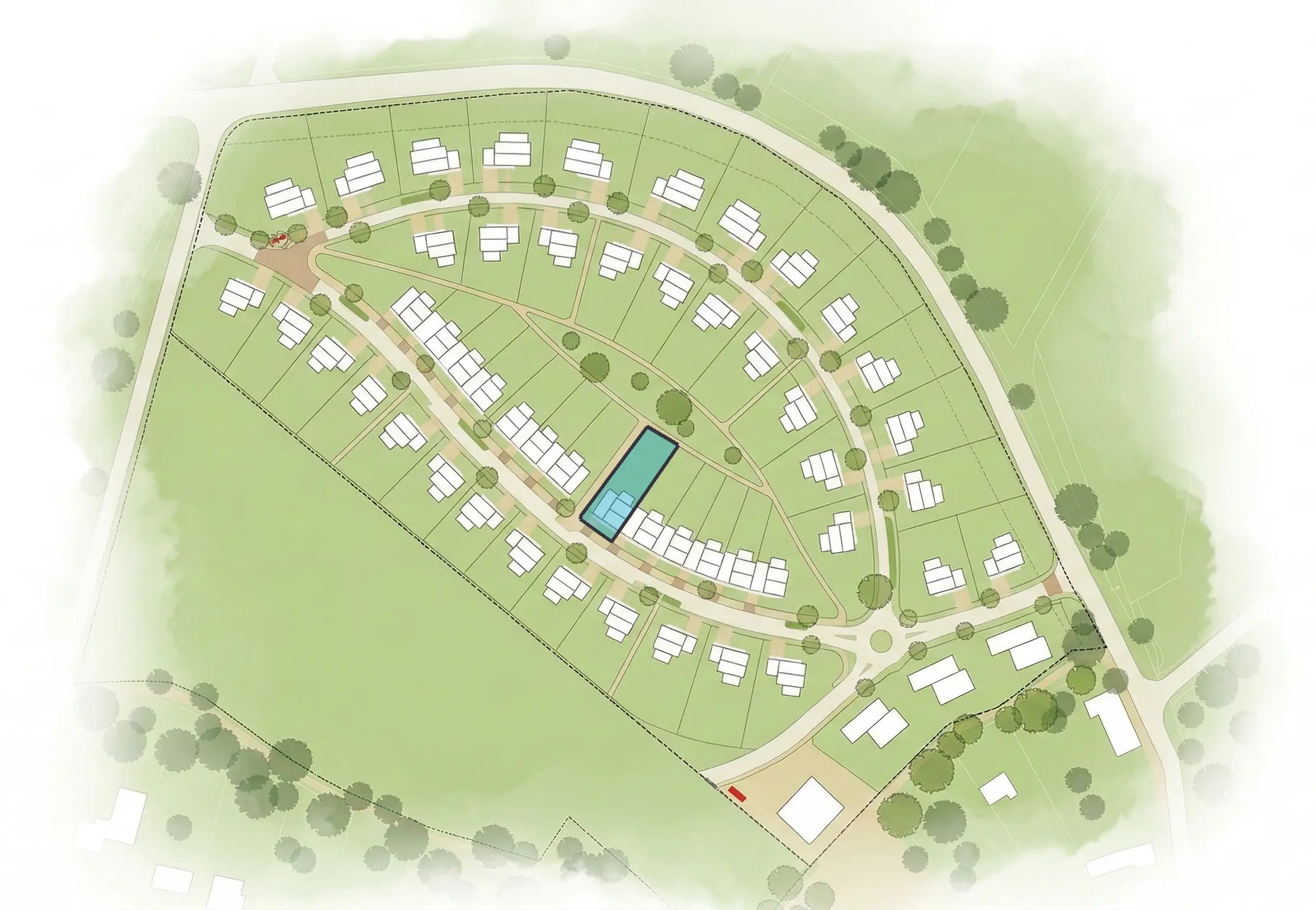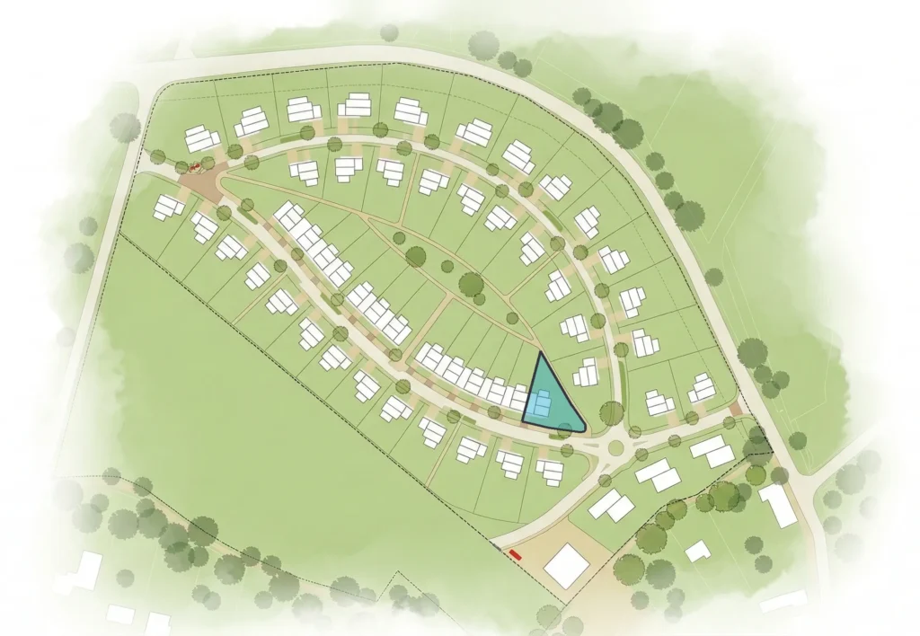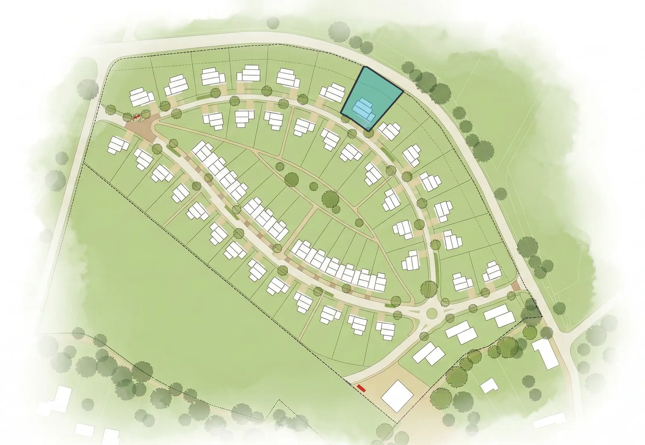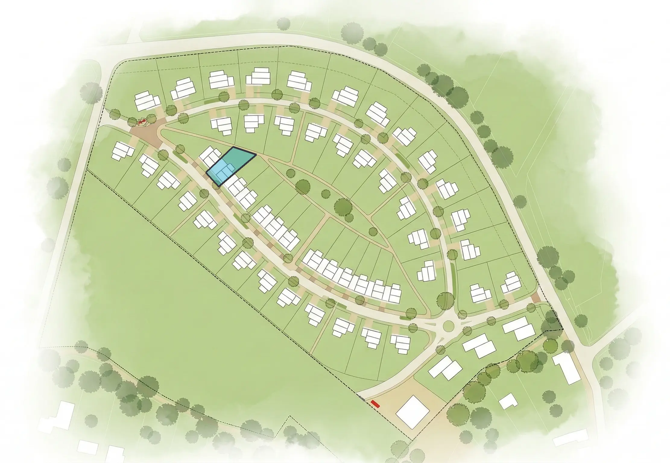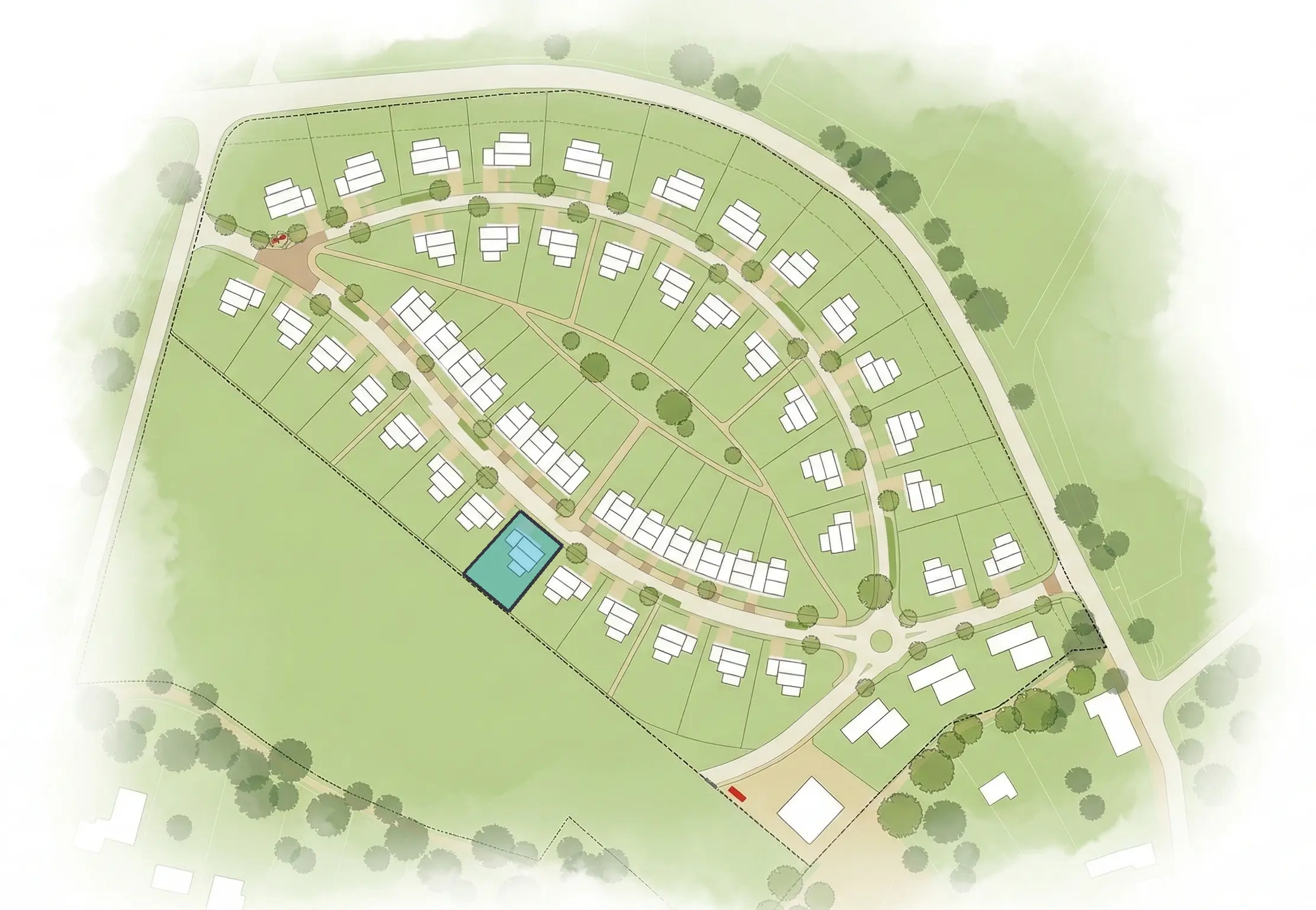 Krajní pozemek s malým počtem sousedů blízko sociální infrastruktury.