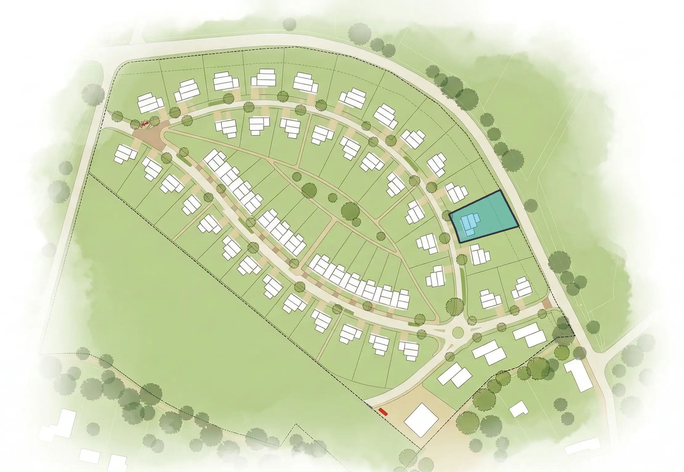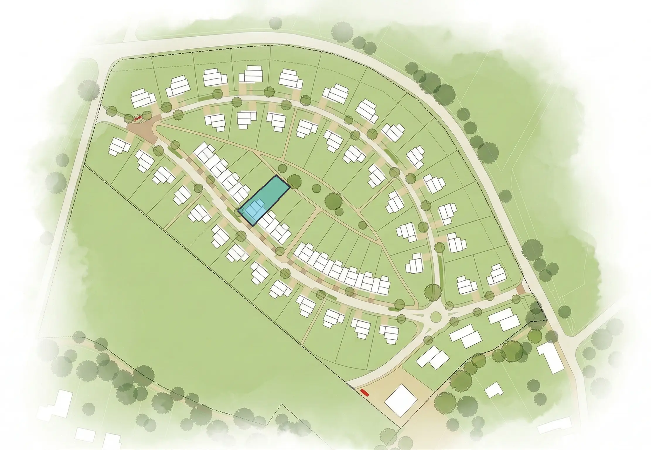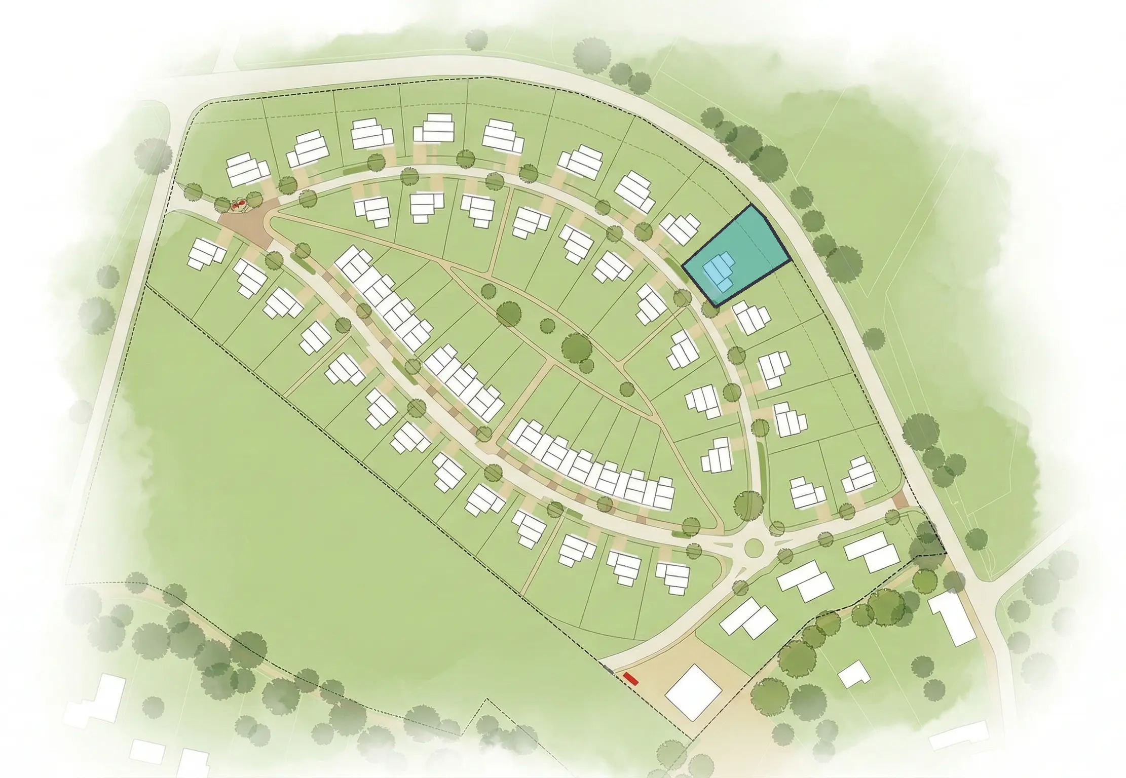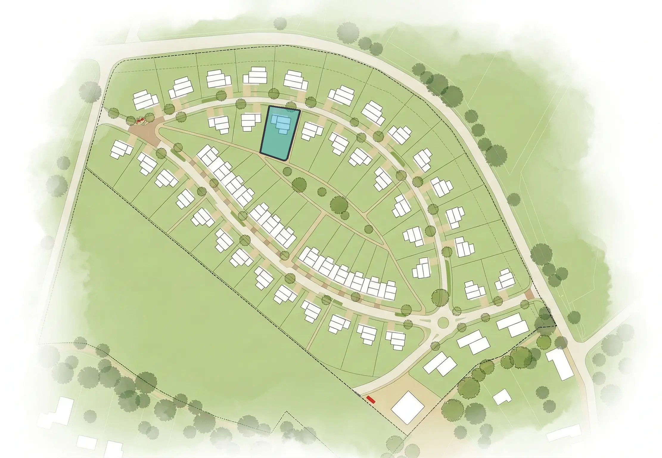 Krajní pozemek s malým počtem sousedů blízko sociální infrastruktury.