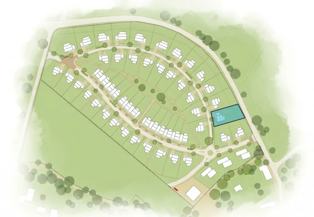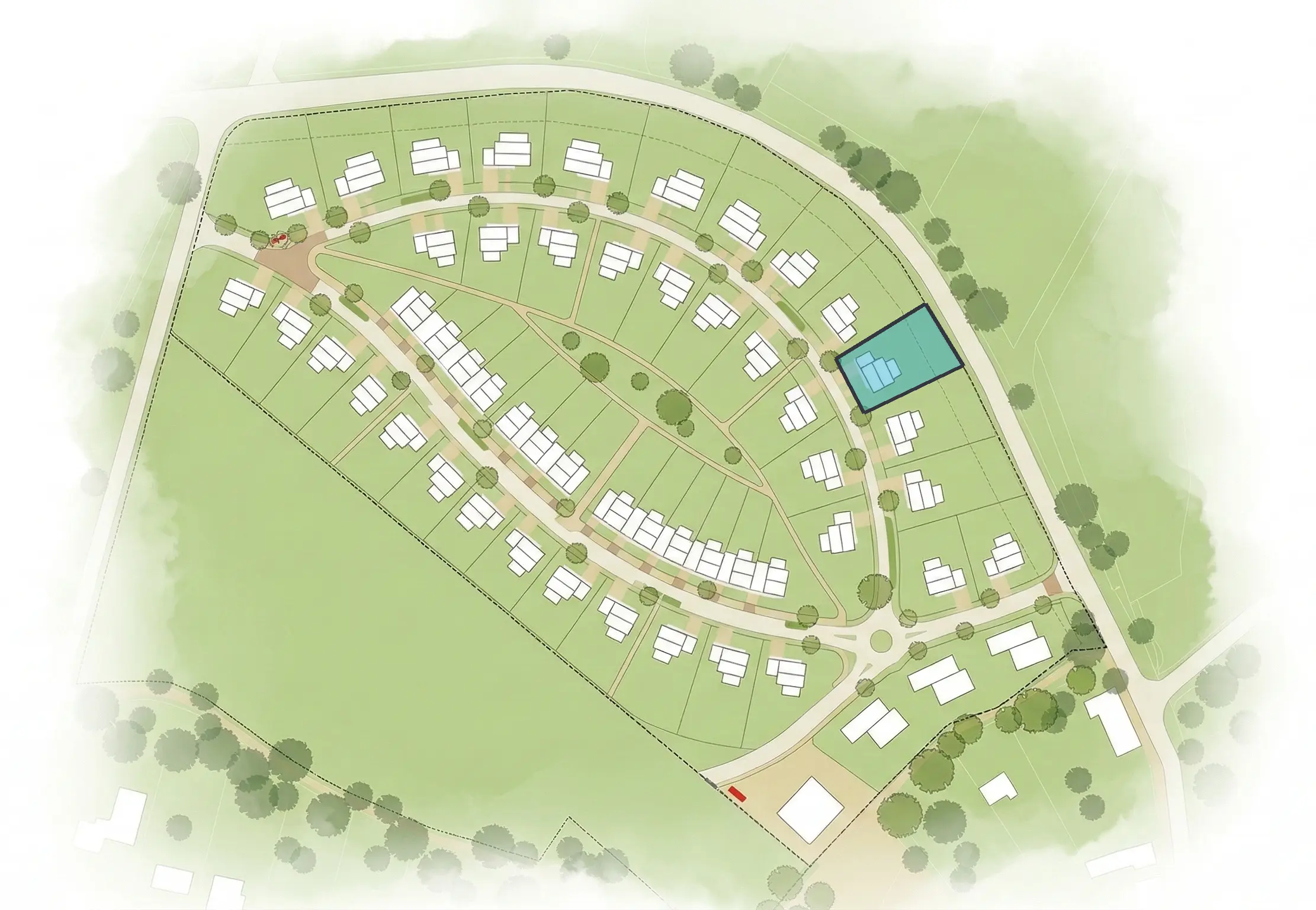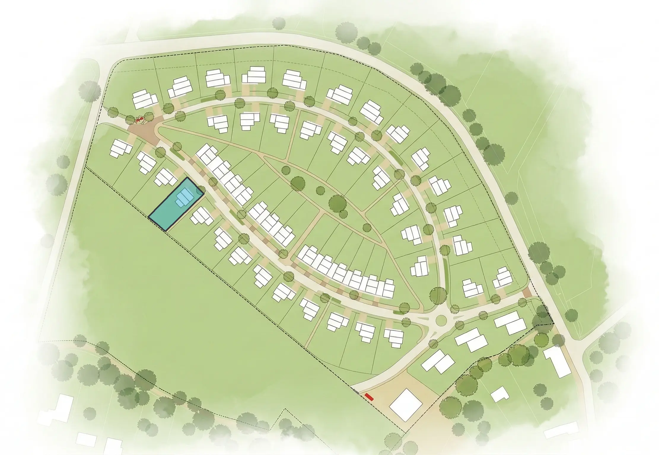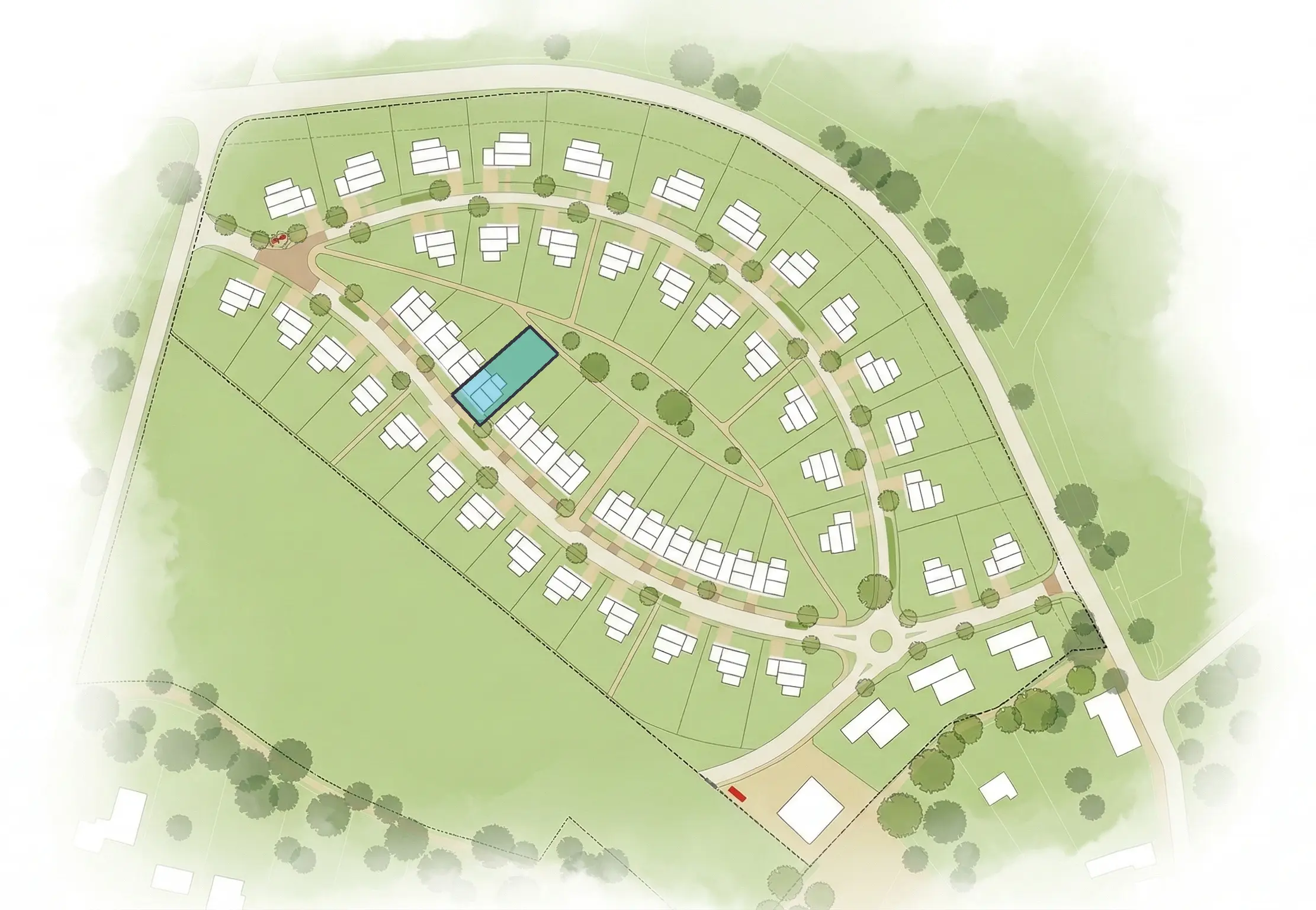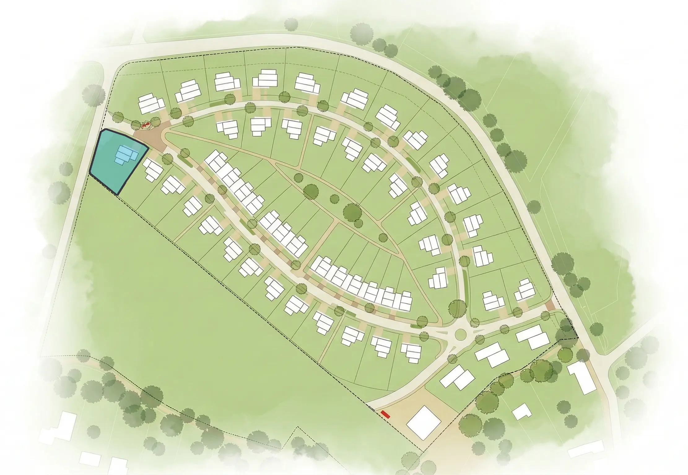 Krajní pozemek s malým počtem sousedů blízko sociální infrastruktury.